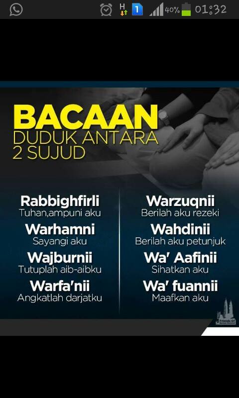 Bentuk duduknya adalah iftirosy, yaitu kaki kiri diduduki dan kaki kanan ditegakkan. Bacaan takbiratul ihram yang benar 2. Dalam hadis tersebut dikatakan inilah doa yang dibaca nabi saat duduk di antara dua sujud. ayat mutasyabihat nak lalu ; Kontroversi bacaan doa di antara dua sujud.