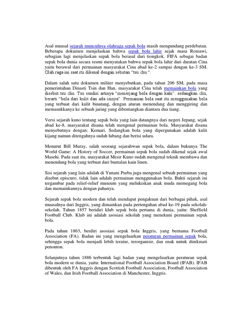 Dalam Sejarah Sepak Bola Fifa Berdiri Pada Tahun from imgv2-2-f.scribdassets.com We did not find results for: Maybe you would like to learn more about one of these? Check spelling or type a new query. It is played by approximately 250 million players in over 200 countries and dependencies, making it the world's most popular sport. The game is played on a rectangular field called a pitch with a goal at each end. Association football, more commonly known as simply football or soccer, is a team sport played with a spherical ball between two teams of 11 players.