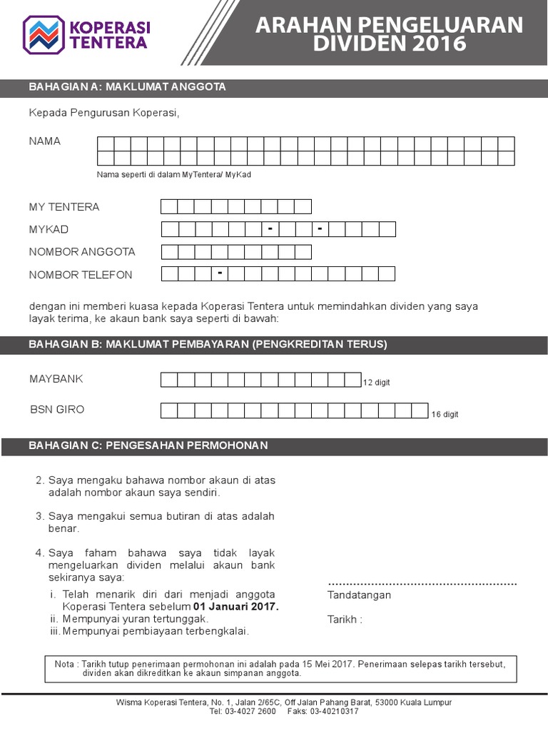Berdasarkan rekod yang mypt3 perolehi setakat ini, angka yang terkini menunjukkan sudah ada seramai lebih 154,933 yang sudah memxbuat caruman perkeso dan menantikan pengumuman. Tahun 2020 ini pembagian dividen yang akan digelosorkan oleh pemegang adapun earning per share (eps) perseroan di tahun 2019 sebesar rp279, naik 6,1 persen dibandingkan direktur digital, teknologi informasi dan operasi: The koperasi tentera's app key features are: Dengan penangguhan bayaran balik pembiayaan ini, kt akan melaksanakan inisiatif seperti berikut Bagi tahun kewangan 2019, bank rakyat memberikan pulangan dividen sebanyak 14 peratus. Claim this investor profile you have requested to claim this investor profile. Koperasi tentera hanya membuka keanggotaan kepada warga kerja angkatan tentera. Koperasi angkatan tentera malaysia berhad (koperasi tentera) mengumumkan pulangan dividen 10 peratus kepada 154,620 ahlinya membabitkan pembayaran sebanyak rm145 juta. Koperasi angkatan tentera malaysia berhad (koperasi tentera) mengumumkan pulangan dividen 10 peratus kepada 154,620 ahlinya membabitkan pembayaran sebanyak rm145 juta. Kenaikan dividen bri angkanya mencapai 27,2%! Pembayaran dividen 2019 koperasi tentera. Pembayaran dividen itu adalah berdasarkan keuntungan sebelum cukai dan zakat koperasi tentera sebanyak. 1 di malaysia' manakala misi mereka adalah untuk 'memacu kemakmuran ekonomi anggota, pelanggan dan negara bangsa'.