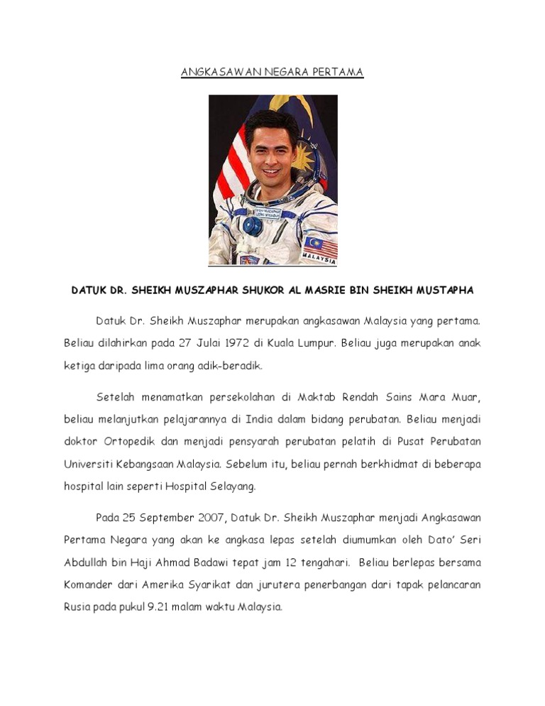 Malam itu gelap pekat, tiada sebiji bintang pun yg kelihatan di ~. Pertama, anda perlu mahir dalam bahasa rusia kerana semua kelas, panduan dan butang panel pada soyuz juga dalam bahasa rusia. Tiga orang awak dan dua pilot akan merasakan sensasi berada di lingkungan tanpa gravitasi selama sekitar 30 menit sebelum akhirnya kembali ke bumi. Sheikh muszaphar shukor pasti semua rakyat malaysia mengenali nama berkenaan memandangkan beliau adalah angkasawan pertama negara. Angkasawan orang yg terlatih utk menyertai misi ke angkasa lepas (ke bulan dsb): Banyak perkara yang saya belajar dalam menjadi seorang angkasawan. Saya kira yah sesakit apa sih? Angkasa lepas jom ikuti kami di media sosial : Untuk pengetahuan anda, dato' dr sheikh muszaphar shukor merupakan angkasawan malaysia pertama ke angkasa lepas pada 10 oktober 2007 merupakan doktor bedah ortopedik, dr sheikh muszaphar berada di angkasa lepas selama 10 hari 21 jam dan 14 minit menjadi orang pertama. 1969 manusia pertama menjejakkan kaki. Idea perjalanan ke angkasa kelihatan menarik. Permintaan yang tak mungkin aku tolak, karena dia adalah sosok yang selalu ku impikan. Sebelum ini, spacex pernah membuat penghantaran kargo beberapa kali ke angkasa, tetapi ini adalah kali pertama mereka berjaya menghantar manusia.